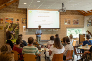 De dag werd afgesloten met enkele dankwoorden en een heerlijke borrel verzorgd door lokale vrijwilligers. Het was een mooi aangezicht om verspreid in het centrum en op het terras buiten IVN’ers met elkaar in gesprek te zien, met in de ene hand een drankje en de andere een hapje, tevreden. En toen de laatste deelnemers vertrokken, trokken de hemelsluizen open. Ook de aarde weer tevreden. In de woorden van IVN’er Hans: ‘Het was een dag waarin je gelijk op het niveau van het hart terechtkwam met elkaar, daar waar het om draait.’