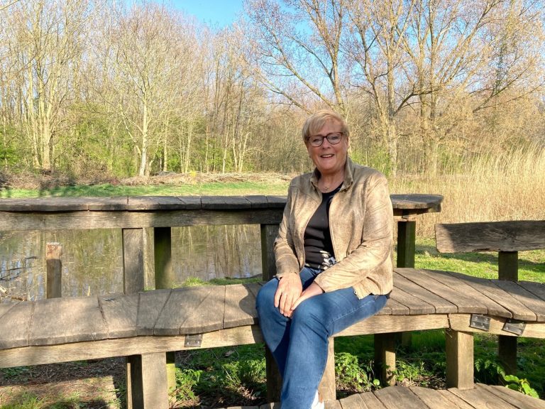Achter Bezoekerscentrum de Veenweiden staat de grote trots van Gerda: een buitenleslokaal dat bestaat uit grote houten banken, beschut onder een boom. Gerda: ‘Waarom zou je binnen zitten, buiten is het veel leuker!’ Het buitenlokaal was een van haar eerste initiatieven 11 jaar geleden toen ze actief werd voor IVN. Gerda was altijd al geïnteresseerd in educatie en natuur: ze studeerde aan de pedagogische academie, met biologie als keuzevak. Daarna werkte ze in het bedrijfsleven, maar de natuur bleef kriebelen.
