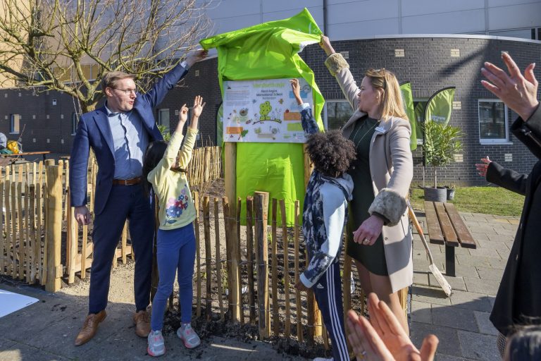 Wethouder Arno Bonte opent samen met leerlingen eerste Voedselbosje op schoolplein Nord Anglia ISR